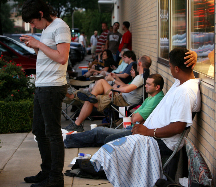 ▲ 2008 年 7 月 11 日,美国达拉斯,人们在苹果专卖店前等待 iPhone 3G 发售 图片来自:视觉中国