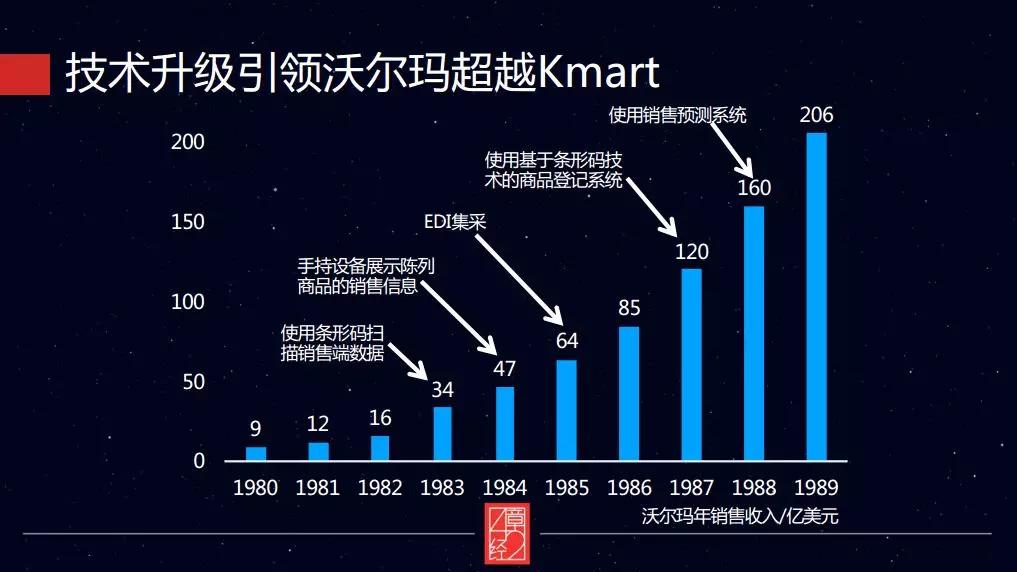 而今天采用的 Big Data、BI,包括 AI 的一些应用,沃尔玛在 1988 年就已经开始采用。所以在不到十年时间里,沃尔玛的整个销售额翻了近 25 倍,一举超过 Kmart,成为全球最大的零售企业。
