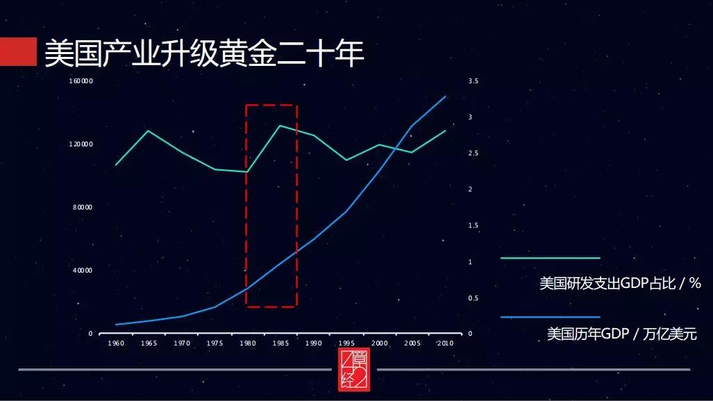 从上图绿色的曲线中可以看到,当年美国研发支出的 GDP 占比达到了 3%。通过在信息技术方面以及对产业升级的大力投入,美国迎来了从 1982 年到 1999 年近 20 年的迅猛增长。美国的零售服务业、生产性服务业、电子信息制造业,甚至包括第一产业的农业和养殖业,20 年间在技术和资本市场的驱动下实现从小散到规模化集约,诞生了一大批世界级的优秀企业,引领产业发展。我们研究后称之为,美国产业升级的黄金 20 年。