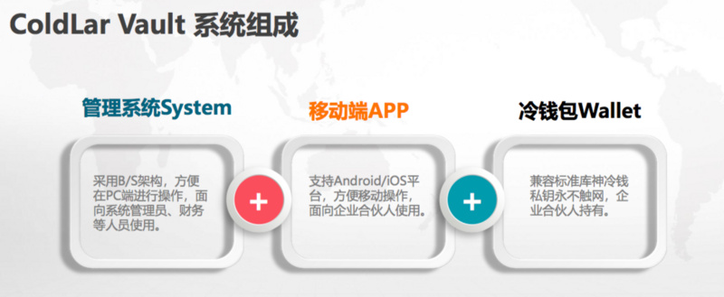 据黄新宇介绍,ColdLar Vault 整个系统由三部分组成:PC 端的软件管理系统,主要供企业内部的财务、出纳等内部人员用;移动端和冷钱包主要给管理层用。如要使用一笔加密资金,财务人员需要在系统中提交申请,然后管理人会在移动端接收到申请并审核,需要配合冷钱包签名;若大部分管理人员批准,该申请即可通过。阈值可以设置为 3/5、5/7 等,根据管理层人数而定。该系统基本支持主流币种,特定主网也提供定制化服务。