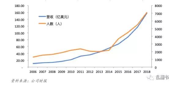 Netflix作为一家千亿美金市值的公司,2018年营收158亿美元,员工人数只有7100人,而估值相当的迪士尼,2018年营收594亿美元,员工人数,20万。