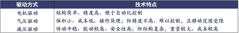 驱动系统位于机器运行的末端,负责带动机械结构,执行控制系统传递来的具体任务。根据驱动形式的不同,主要分为三种驱动方式:电机驱动、气压驱动、液压驱动。三种方式各有优劣,其中以电机驱动在实际中应用较为广泛。