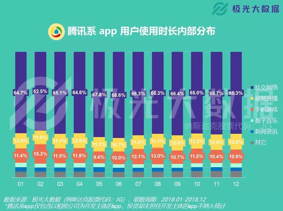 在腾讯应用矩阵中,用户使用时长占比最高的应用类别依次为社交网络、视频直播、手机游戏、数字音乐和新闻资讯。在整个2018年度,以微信和QQ为首的社交网络应用在腾讯系内部的用户时长占比始终超过6成。可见在腾讯系内部,社交网络应用的基石地位无可撼动。
