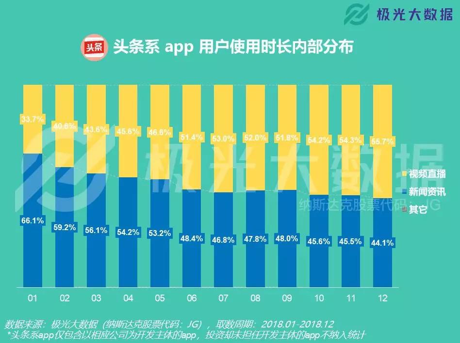 在视频直播类应用的挤压下,新闻资讯应用的内部时长占比下降显著。截至2018年12月,新闻资讯类应用在字节跳动矩阵中的时长占比为44.1%。