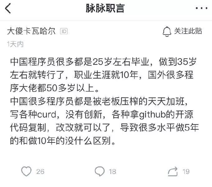 在技术圈,有这样一个认知:程序员是青春饭,过了 35 岁能力体力都跟不上,如果还没转到领导岗位,整个职业生涯也就基本无望了。