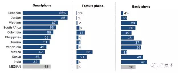 智能手机是最普遍的移动设备类型,大多数成年人表示自己的手机是智能手机,中位国家53%的人表示自己使用这一类型的手机。基本型手机(只能打电话、发短信)、功能手机(可以上网但不支持运行应用)总体来说不太受欢迎,很少有成年人说自己使用的是功能手机。但是在数字经济不发达的地区,比如印度(47%)、肯尼亚(40%),突尼斯(37%)和委内瑞拉(36%)也有部分人使用基本型手机。功能手机则在墨西哥(三分之一)很受欢迎。需要注意的是,后两种手机的主要受众是年龄较大,受教育程度较低的用户。