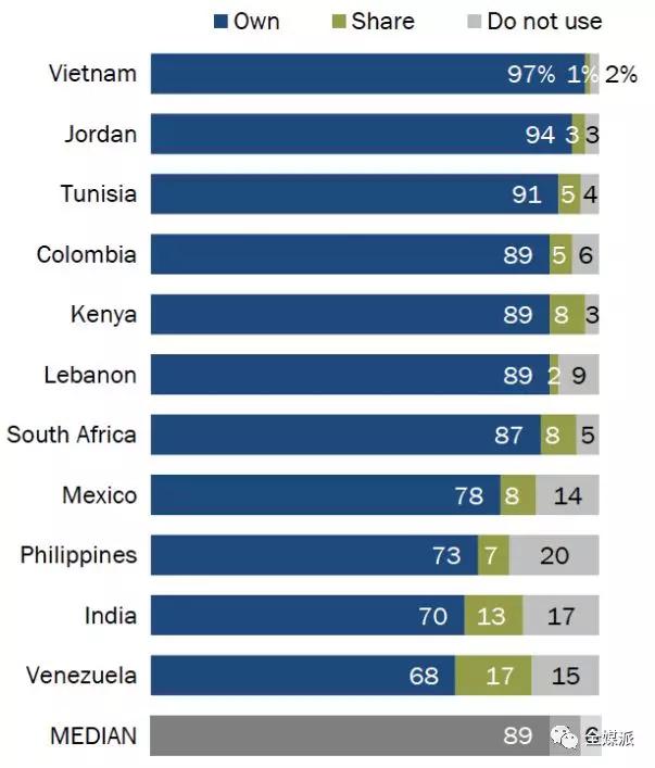 11个国家的大多数成年人拥有,或者可以接触到手机。在这之中,越南当属第一,几乎所有成年人(97%)都拥有移动设备,委内瑞拉,印度和菲律宾相对来说较低,但即使在这些国家,也有大约70%的成年人拥有移动设备。