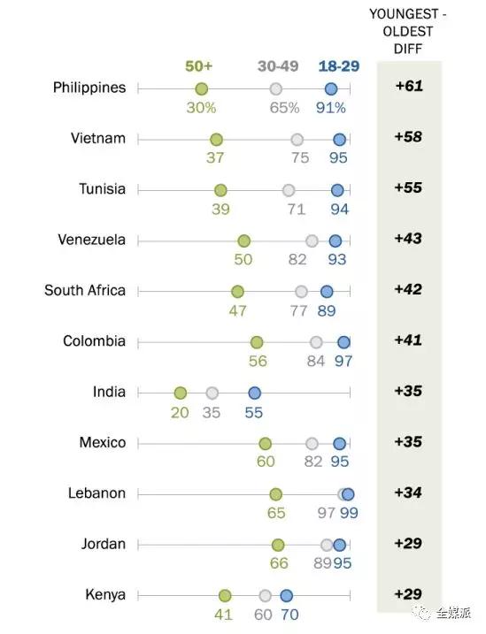 在菲律宾,拥有手机的年轻人(18至29岁)比例比老年人(50岁及以上)高41%,黎巴嫩、印度、墨西哥分别为27%,25%和24%。同样是成年人,接受过中等以上教育的更有可能拥有手机。