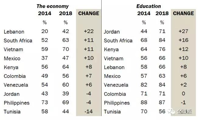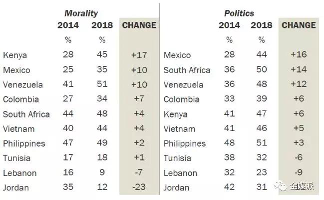 至于新技术对政治的影响,公众舆论向两极飞奔。与2014年相比,在墨西哥,南非,委内瑞拉,肯尼亚和哥伦比亚五个国家中,更多人认同互联网的普及对政治产生积极影响,不过突尼斯人,黎巴嫩人和约旦人持相反的态度。