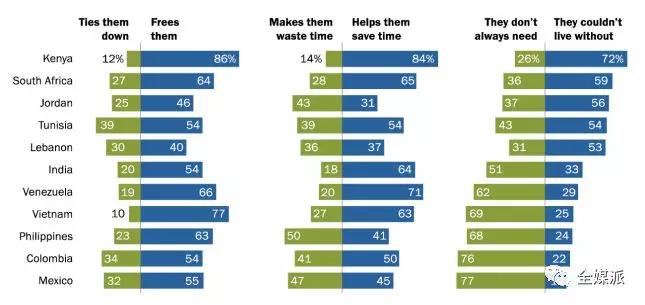 当被问到“手机是节约还是浪费他们的时间”这一问题时,手机普及率最高的七个国家选择了前者,节约时间。倾向于后者的约旦人和菲律宾人比例更高,黎巴嫩和墨西哥的情况则是各一半。