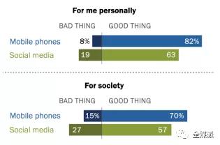 其次,和社会相比,个人得到的好处更多。赞同智能手机和社交媒体有利于社会发展的成年人比例,比肯定两者给个人带来积极影响的低。