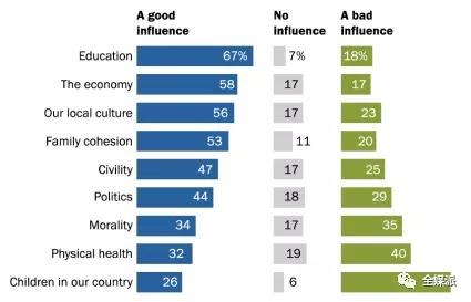 道德滑坡也是人们关心的问题。中位国家35%的人表示电话和互联网对道德产生了不良影响。与2014年相比,肯尼亚,委内瑞拉,墨西哥和哥伦比亚四个国家里,认为互联网对道德产生积极影响的公众更多了,但在约旦和黎巴嫩,人数有所下降。