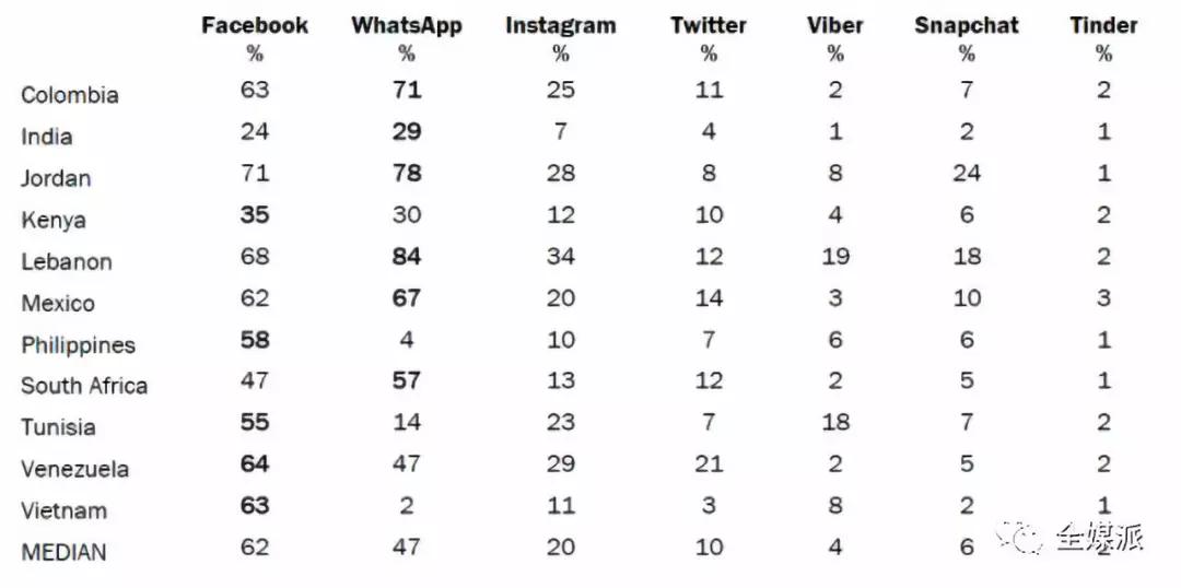 在中位国家,64%的国民使用至少一种社交媒体网站或应用程序(皮尤研究中心共提供7个选项),Facebook和WhatsApp的使用率最高,中位国家的使用人数占比分别为62%和47%。某些社交软件有自己的地域优势, Instagram在黎巴嫩(34%),Viber在黎巴嫩和突尼斯(大约五分之一),Snapchat在约旦人(24%)广受欢迎。教育是社交媒体使用情况的影响因素之一,举例来说,在越南,绝大多数受过更多教育的成年人(85%)使用Facebook,而接受过中等教育的人则为52%。