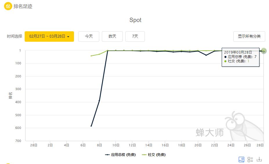 据蝉大师统计,3月7日,Spot重新上架App Store,在社交榜单(免费)中排名第43位,应用总榜(免费)排名第586位。3月9日,其在两份榜单中分别爬升至第1位和第2位。社交领域风头盖过微信,总榜单中热度高过抖音。