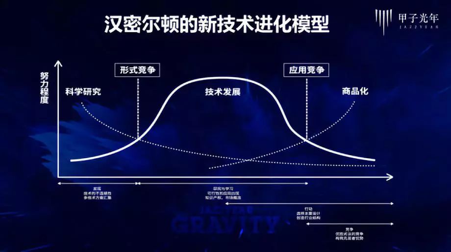 横坐标为新技术发展演化的不同阶段;纵坐标为推进技术发展的努力程度。