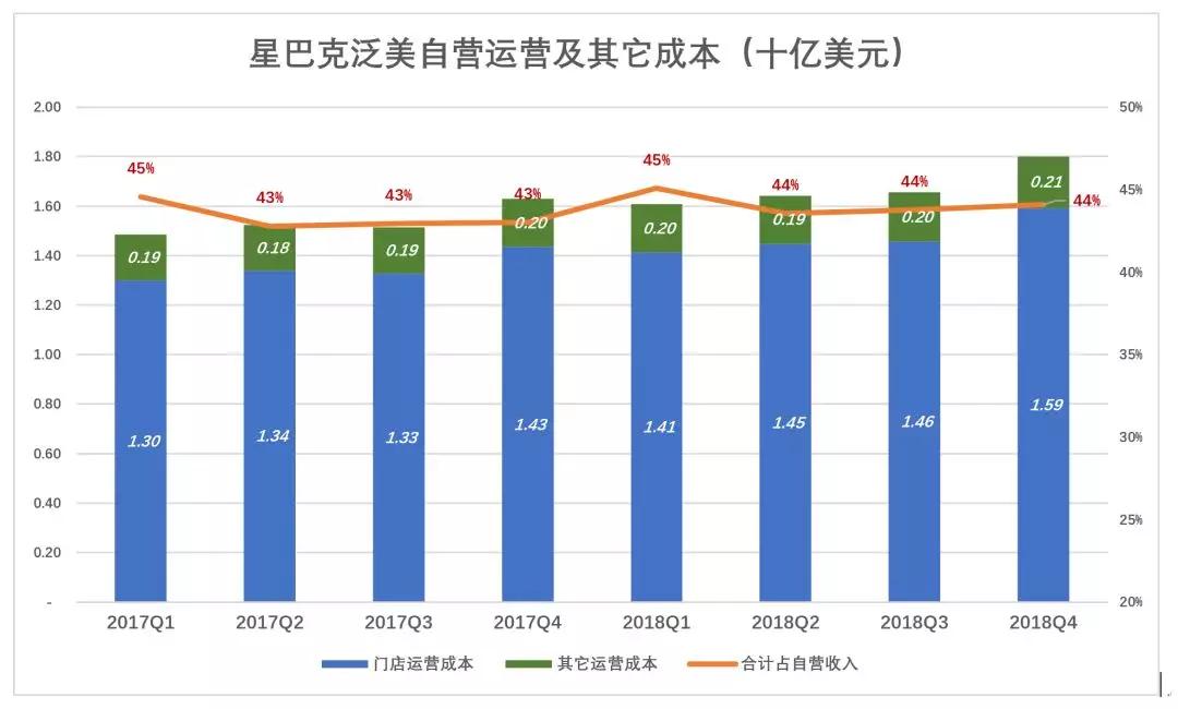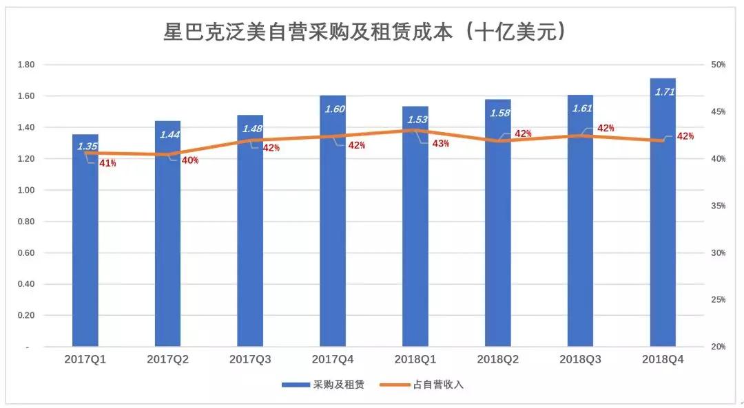 2018年Q4,泛美区自营门店采购及租赁成本17.1亿美元,占收入的42%(比星巴克总体水平低10个百分点),相当于此项成本全球金额的62.1%。也就是说,泛美地区以62%的采购及租赁成本取得全球自营收入的76%。