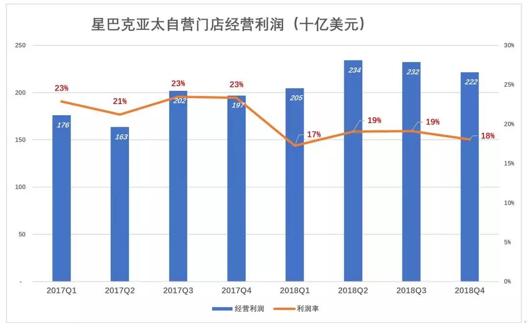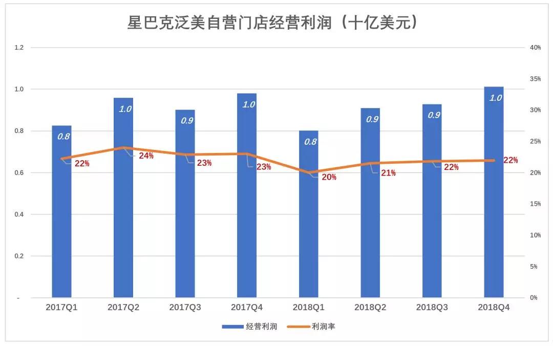 泛美区自营门店采购、租赁、运营诸项成本合计占营收的比例较全球整体水平低12个百分点,加上特许经营收入,星巴克泛美区经营利润率超过20%。2018年Q4,星巴克泛美区经营利润10.1亿美元,利润率22%。