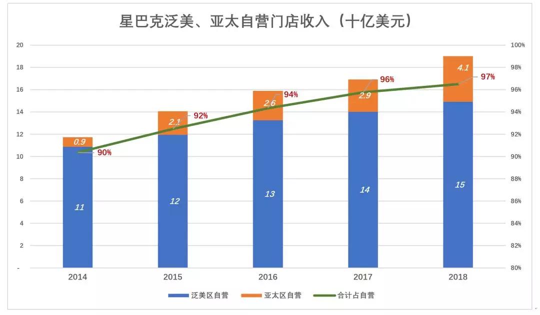 星巴克泛美区包括美国、加拿大、墨西哥及拉丁美洲国家;亚太区包括中、日、韩、泰等国。2018财年,泛美、亚太自营门店、加盟门店总收入分别为192亿美元、6.15亿美元,分别占全球自营、加盟收入的97%、82%。