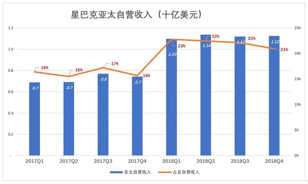 需要提出的是,星巴克泛美区经营利润连续4年“滞长”。2015财年经营利润32.2亿美元、利润率24%,2018财年经营利润36.1亿美元,利润率跌到22%,平均年复合增长率不到4%。如此低的增速显然撑不起20倍的市盈率,星巴克给投资人讲的故事发生在亚洲,更确切地说是发生在中国。