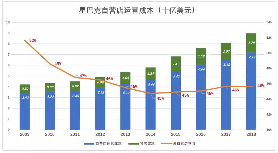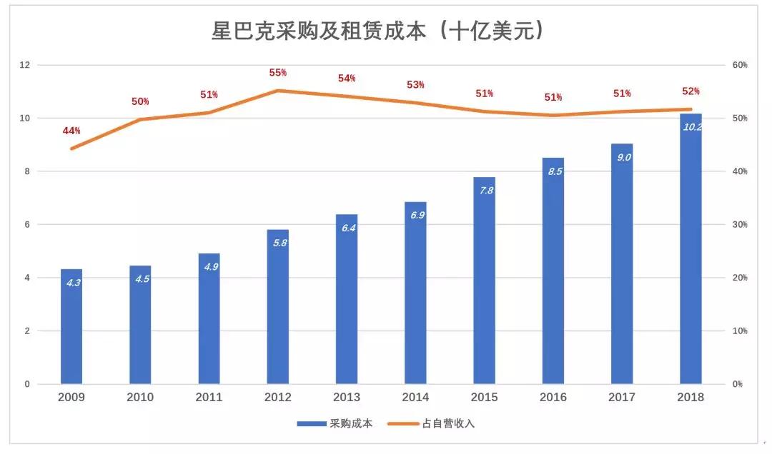 星巴克最重要的支出是原辅料、包装材料采构及自营门店租赁,财报将这几项支付归纳为cost of sales including occupancy costs。2018财年,此项成本首次超过100亿美元,占自营收入的51.7%。