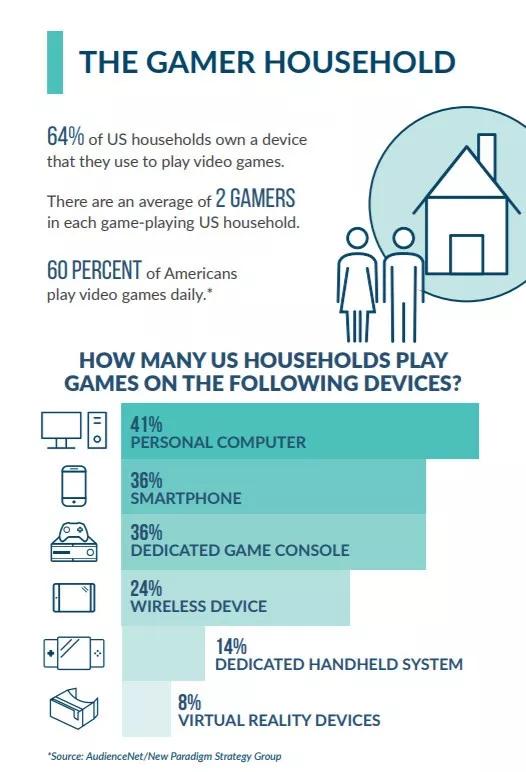 ESA(美国娱乐软件协会)发布的“2017年美国游戏行业研究报告”中显示,其在游戏设备上就更加多元化,除了常用的PC电脑、智能手机之外,家庭游戏主机、便携游戏掌机和VR游戏设备都占据不小的比重。