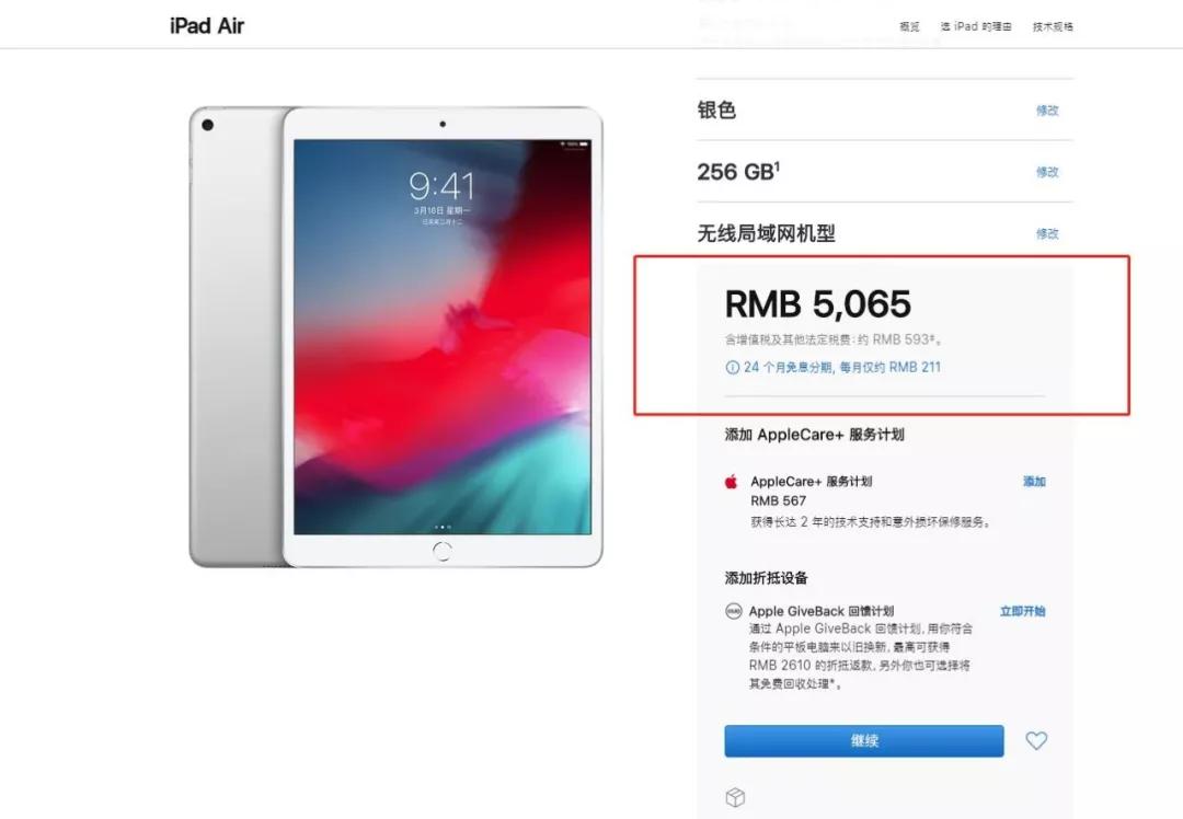 大家可以按照这个公式去计算现在的产品价格:原来的价格* 1.13 / 1.16,以2019款 iPad Air 256G 为例,原官网售价 5199 元,其中价格 4481.90 元+增值税 717.10 元,降税后增值税额 582.65 元,价税合计 5064.55 元,相比原价降了 134.45 元。