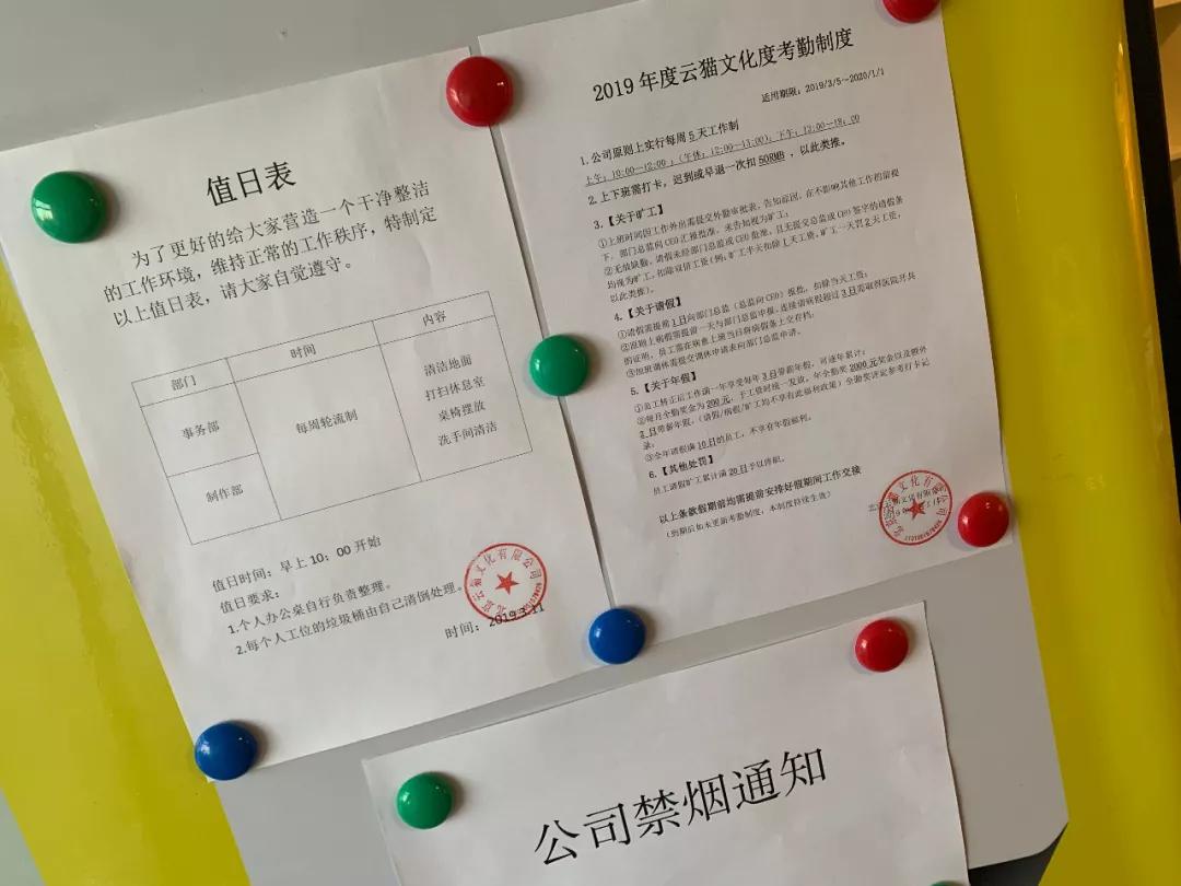 为了培养这一意识,云猫文化所有核心的艺人都需要在公司坐班。在一块大大的白板上,员工的上班、下班以及午饭时间都有着明确的规定。