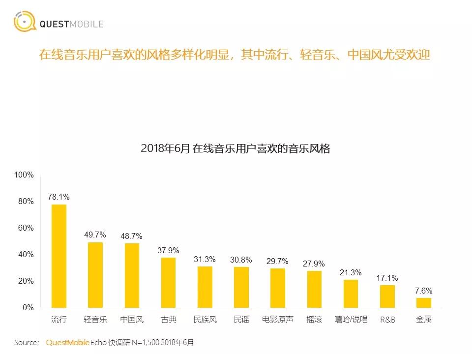 第三方数据机构QuestMobile发布的《中国移动互联网在线音乐行业报告》显示,2018年,在线音乐用户喜爱的音乐风格多样化日趋明显。在统计中,喜欢流行音乐的用户高达78.1%,轻音乐、中国风、古典音乐等也开始慢慢拥有各自的市场份额。