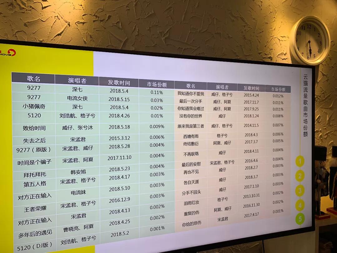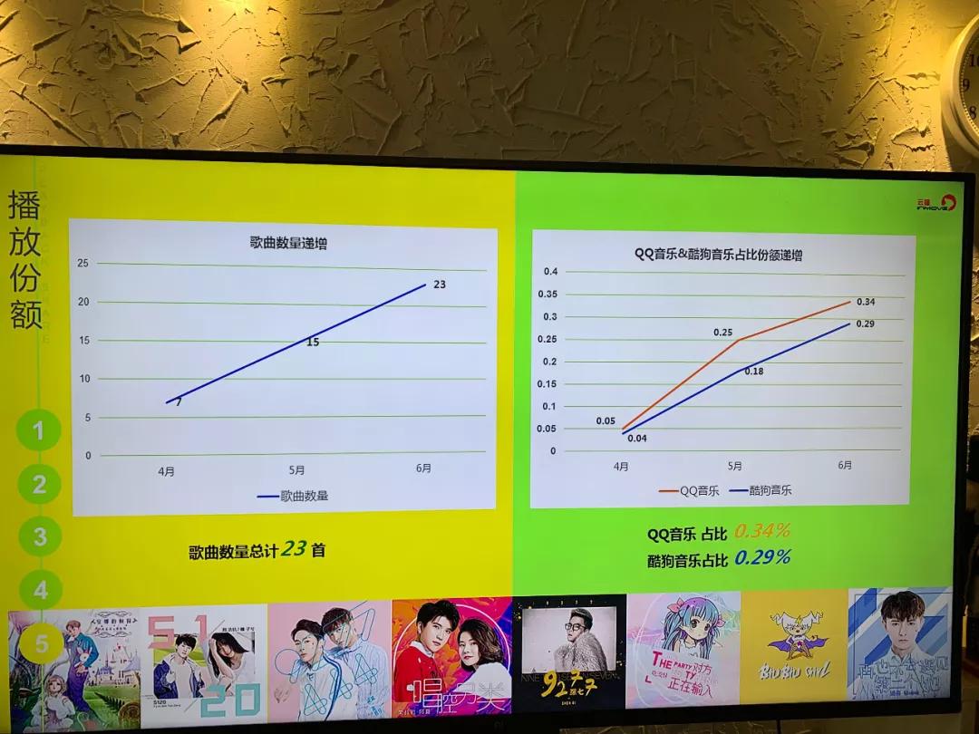 宋孟君与他的合伙人共同研发出了一套数据化管理模型。“我们的目标今年是两个点(份额),每个歌手每个月发歌多少、预估市场份额多少都是数据化的。从现在的数据来看,第一季度的KPI我们已经超额完成了。”