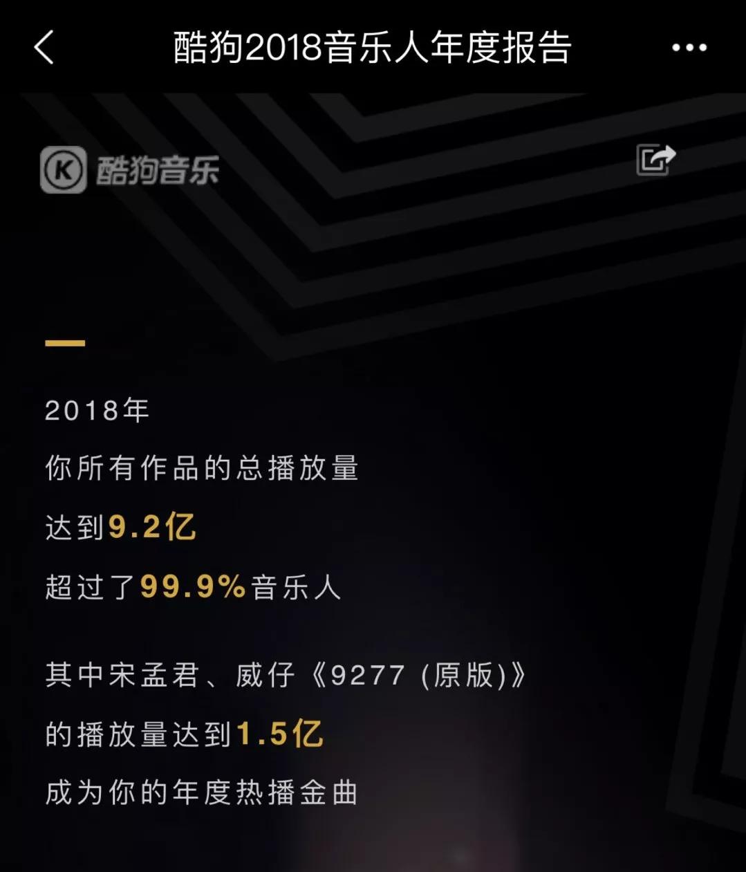“歌曲的好坏无法被量化,但是数据是可以量化的。”宋孟君说,“光是在酷狗音乐的后台,2018年的我个人的歌曲播放量就达到了9.2亿,所有作品下载量已经达到了808万次。如果平均是两元下载一首歌曲的话,我个人在2018年的总作品就创造了1600万的人民币的价值。”