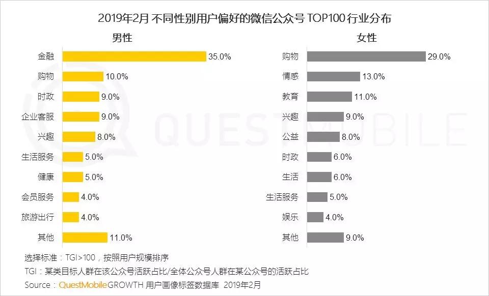2、男性用户更偏好关注金融类公众号,了解各类金融理财信息,而女性用户购物热情高,其次对于情感、教育(儿童教育较多)等兴趣也很高
