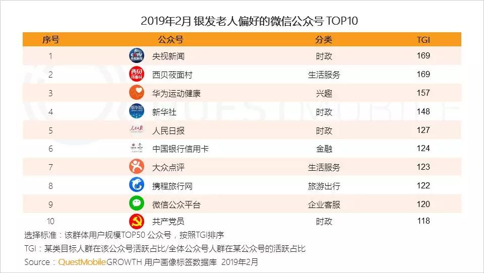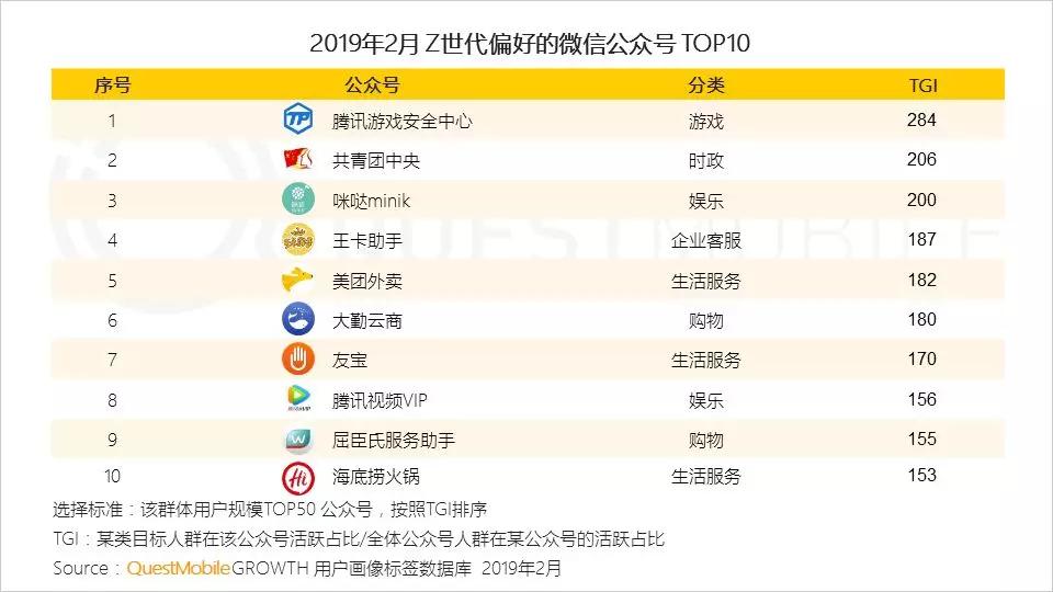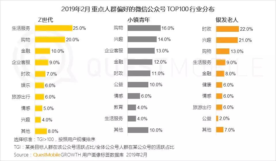 5、不同人群关注的公众号类型差异明显:Z世代更关注与吃喝玩乐相关的生活服务类公众号,小镇青年偏好购物,而银发老人更关注国家大事