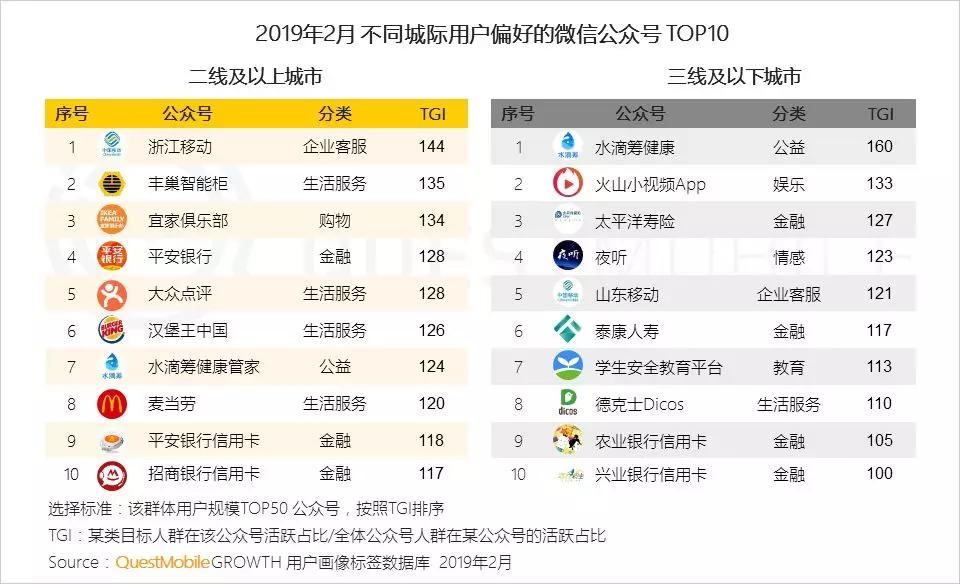 4、二线及以上城市用户逐步习惯通过生活服务、购物、金融、旅游出行等公众号获取各类生活便民服务,三线及以下城市用户主要使用购物、兴趣类公众号