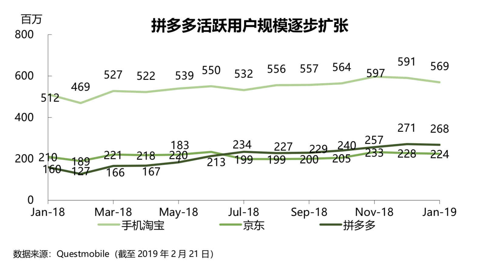 如果说ICC的数据说明是冰冷且抽象的,那拼多多的强势崛起则是社交电商勃勃生机的典型代表。从用户量上来说,拼多多已经成为当之无愧的第二大电商。财报数据显示,就年度活跃用户数而言,拼多多在2018第二季度首次超越京东,并在2018全年共收割4.2亿活跃买家,远远超过京东的3.1亿。此外,第三方数据平台QuestMobile公布的数据也显示,早在去年7月拼多多的月活跃用户数就已经超过京东。拼多多作为社交电商的代表之作,充分的展示了社交电商在用户规模获取上的广阔前景。