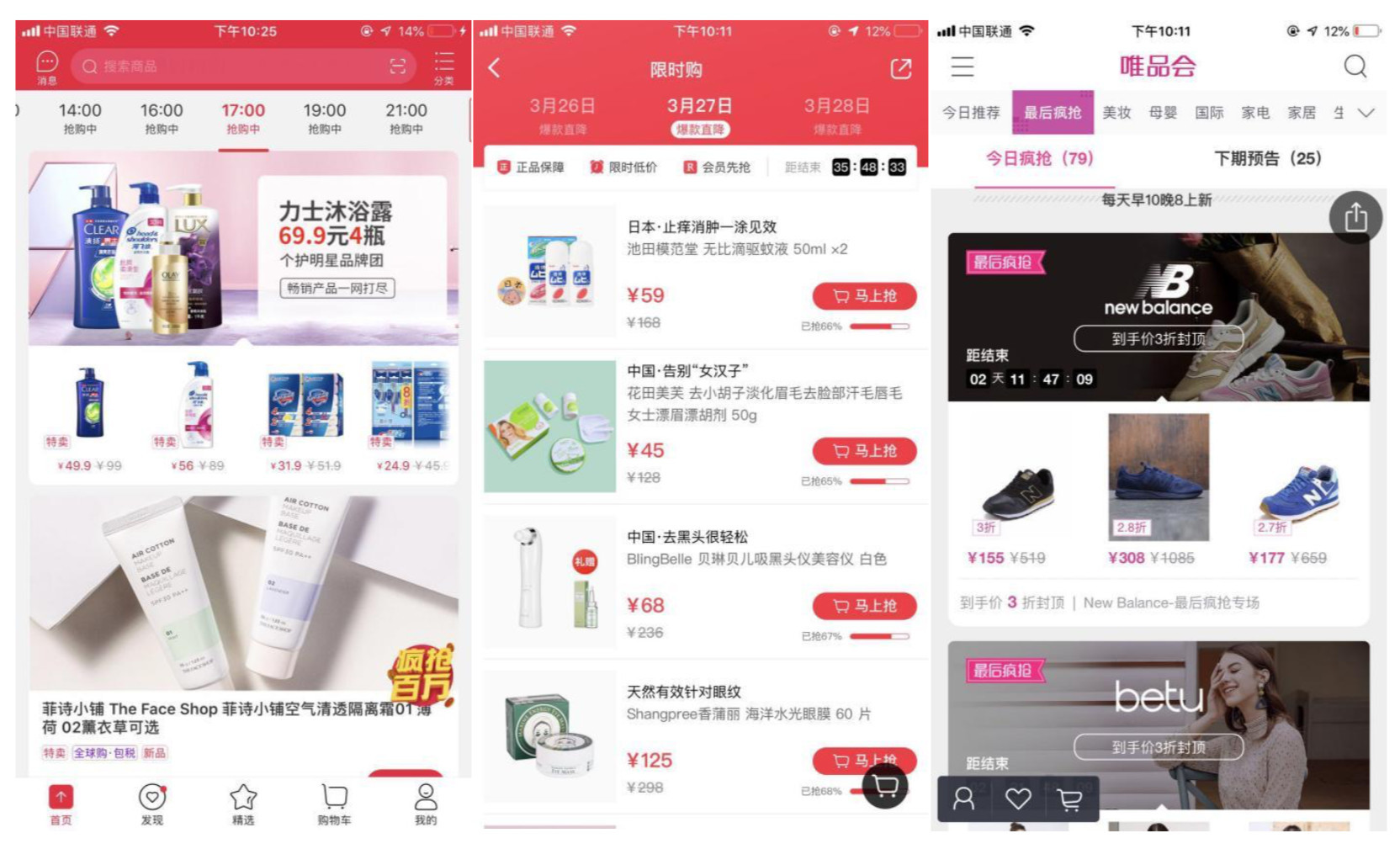 云集、小红书、唯品会特卖页面对比。资料来源:云集、小红书、唯品会(截至2019年3月27日)