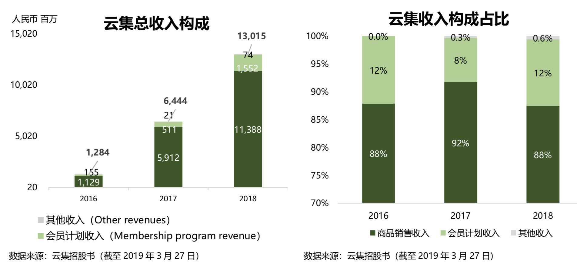 2018 年,云集总营收达到人民币 130 亿元,同比增长102%。其中商品销售收入为114亿元,同比增长93%,占总营收的比重高达88%。第二大收入来源会员计划收入为 15.5 亿元,同比增长204%,占总营收的比重由2017年的8%提升至12%。其他收入为7440万元。