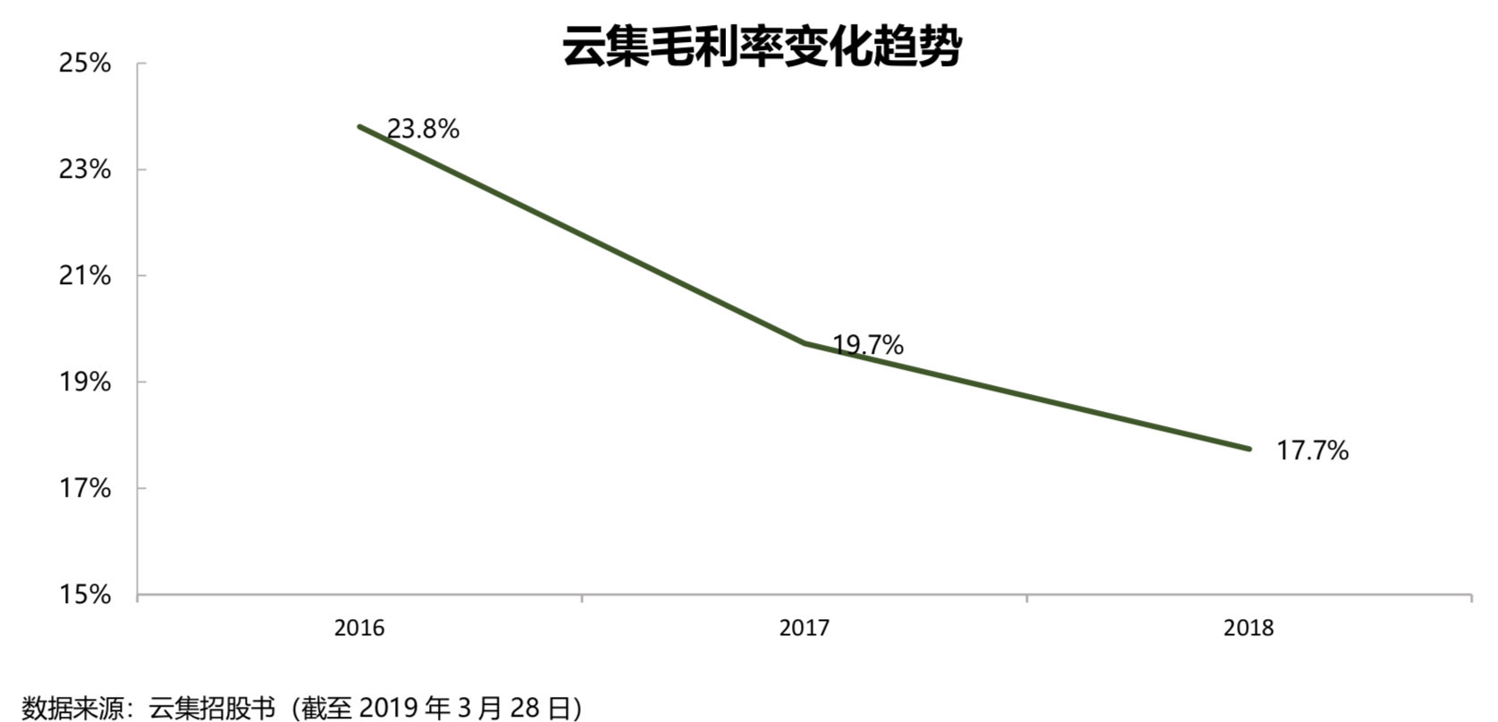 由于营业成本快速增长,云集的毛利率也相应走出下降态势。2016/2017/2018年,云集的毛利率水平分别为23.8%,19.7%和17.7%。