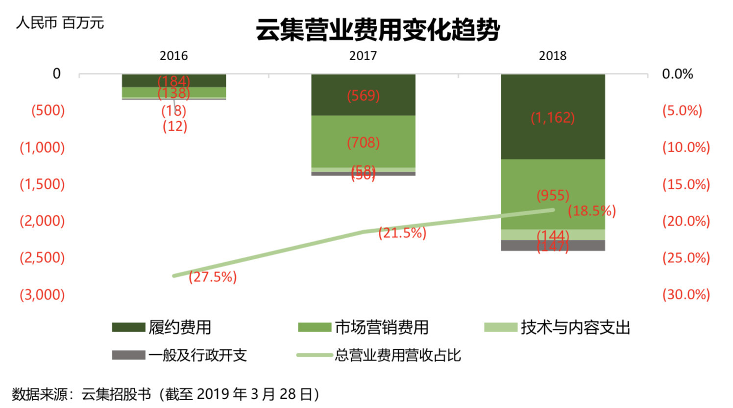 招股书公布的数据显示,伴随着营收规模的快速增长,云集的营业成本(Cost of Revenues)也在快速上扬,且增长速度超过总营收。2016/2017/2018年的营业成本人别为9.8亿元、51.7亿元、107.1亿元,2017/2018年同比增速分别为429%/107%,对应的总营收增速分别为402%/102%。