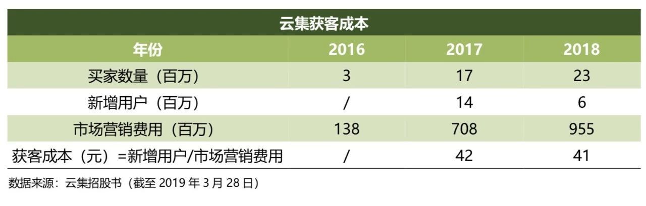 与拼多多相比,云集花给市场营销的钱可谓“九牛一毛”。截至2018年,市场营销费用占总营收的比重由2016年的10.7%下降至7.3%。2017/2018年的获客成本分别为人民币42元、41元,稳中略降。