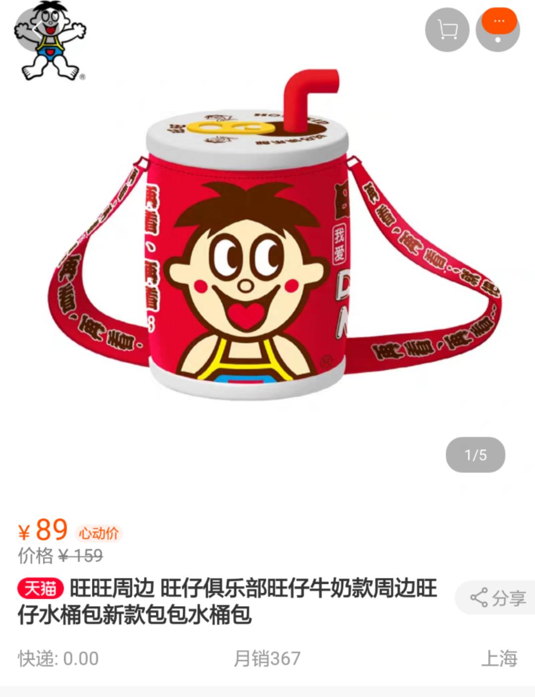 从目前旗舰店还在架的衍生品来看,卖得最好的是旺仔牛奶款水桶包,月销367件,价格在89元,大部分购买者都是抱着“成为最靓的仔” 这样的情怀入手的,但在评论里,也有不少人反馈包的质量不及预期。