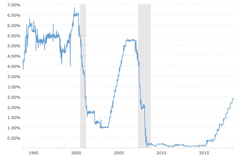 这五年形成的泡沫由宽松货币、冒进资本、市场过度自信及纯粹投机所支撑。从1994 年2月至1995年2月,经过连续7次加息, 美国联邦基金目标利率从3.00%上升300 BP至6.00%;从1999年6月至2000年5 月,经过连续6次加息,联邦基金目标利率从4.75%上升175 BP至6.50%。