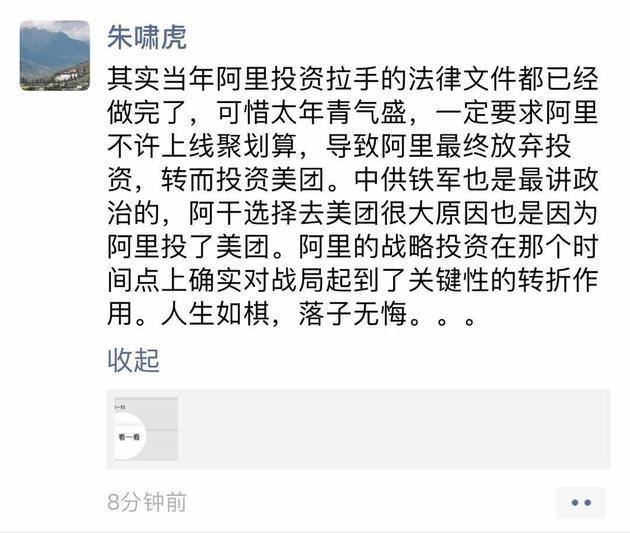 “其实当年阿里投资拉手的法律文件都已经做完了,可惜太年青气盛,一定要求阿里不许上线聚划算,导致阿里最终放弃投资,转而投资美团。中供铁军也是最讲政治的,阿干(干嘉伟)选择去美团很大原因也是因为阿里投了美团。阿里的战略投资在那个时间点上确实对战局起到了关键性的转折作用。人生如棋,落子无悔。”