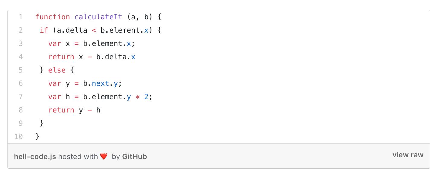 鬼知道它到底是干嘛的啊。这样的代码可能可以运行,但当我们需要修改它的时候,我们必须祈祷写这几行代码的人还在公司,祈祷他们能够以某种方式破译这些可能已经运行了好几年的代码。