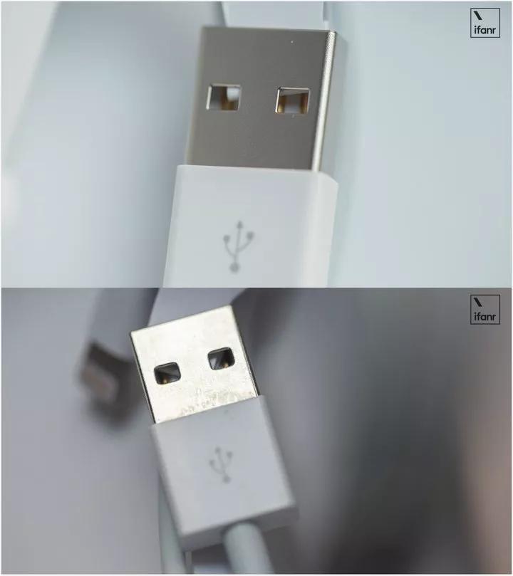 附赠的 Lightning 线缆不整洁,金属端口做工略差。