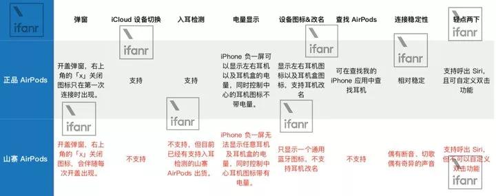并且有意思的是,实际上这些山寨耳机并没有伪装得很完美,它们在 iOS 设备上还是露出「马脚」,我们将这些差异整理成一份参照表,供大家参考: