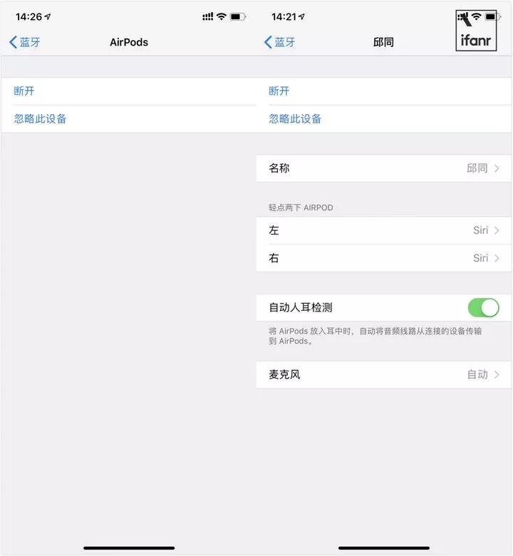 山寨 AirPods 无法显示正品 AirPods 左右耳机图标以及耳机盒图标,它的图标为一个蓝牙标识,且不支持更改耳机名称,更不能自定义双击功能。