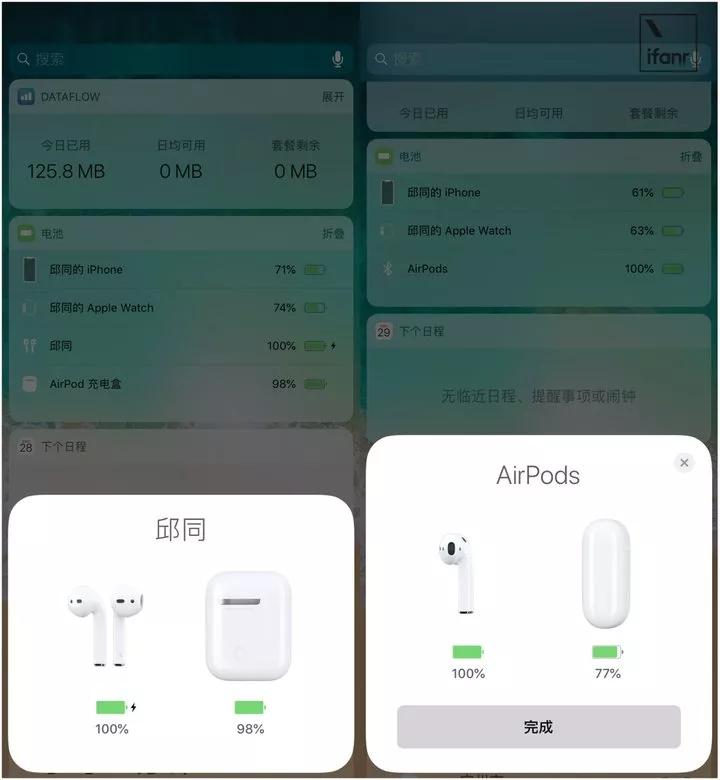 山寨的 AirPods 无法在 iPhone 负一屏中显示左右耳机以及耳机盒的具体电量,山寨 AirPods 的耳机电量与普通蓝牙耳机连接 iPhone 一样,显示在控制中心的蓝牙图标旁边(正品是不会在蓝牙图标旁出现电量)。