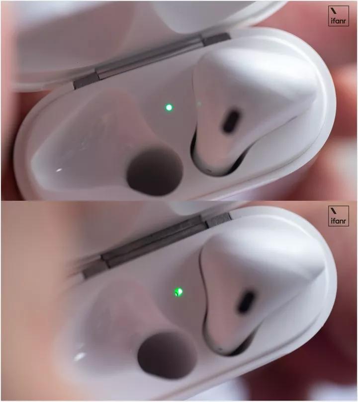 耳机盒电源指示灯过亮,灯色不柔和(据卖家介绍,更新版本的山寨 AirPods 已经「克服」了这一问题)。