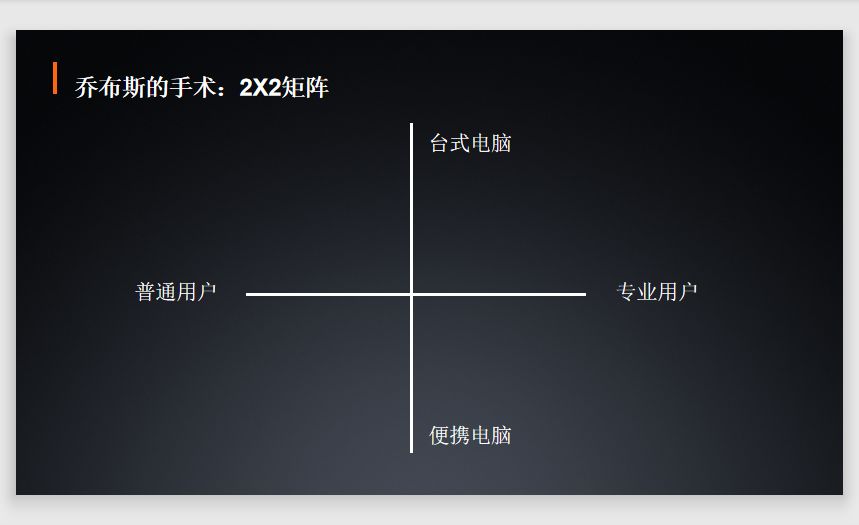 我们看看乔布斯。1997年,乔布斯回到苹果,发现公司的现金只能用两个月,而整个苹果的产品线中有1000多款产品,但是找不到一个挣钱的产品。乔布斯说,我们做减法,他想到了矩阵思维。