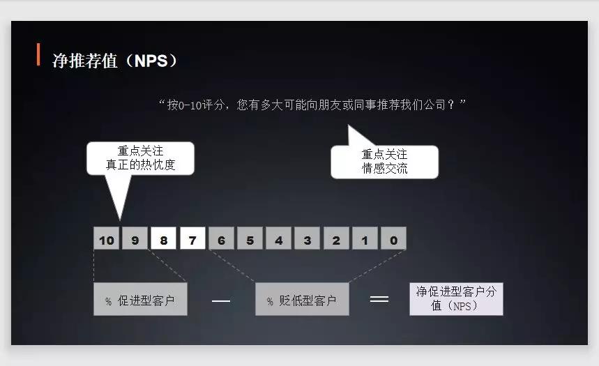 而关于留存,净推荐值(NPS)非常重要,它可以预测公司的增长状态。什么是净推荐值(NPS)?——